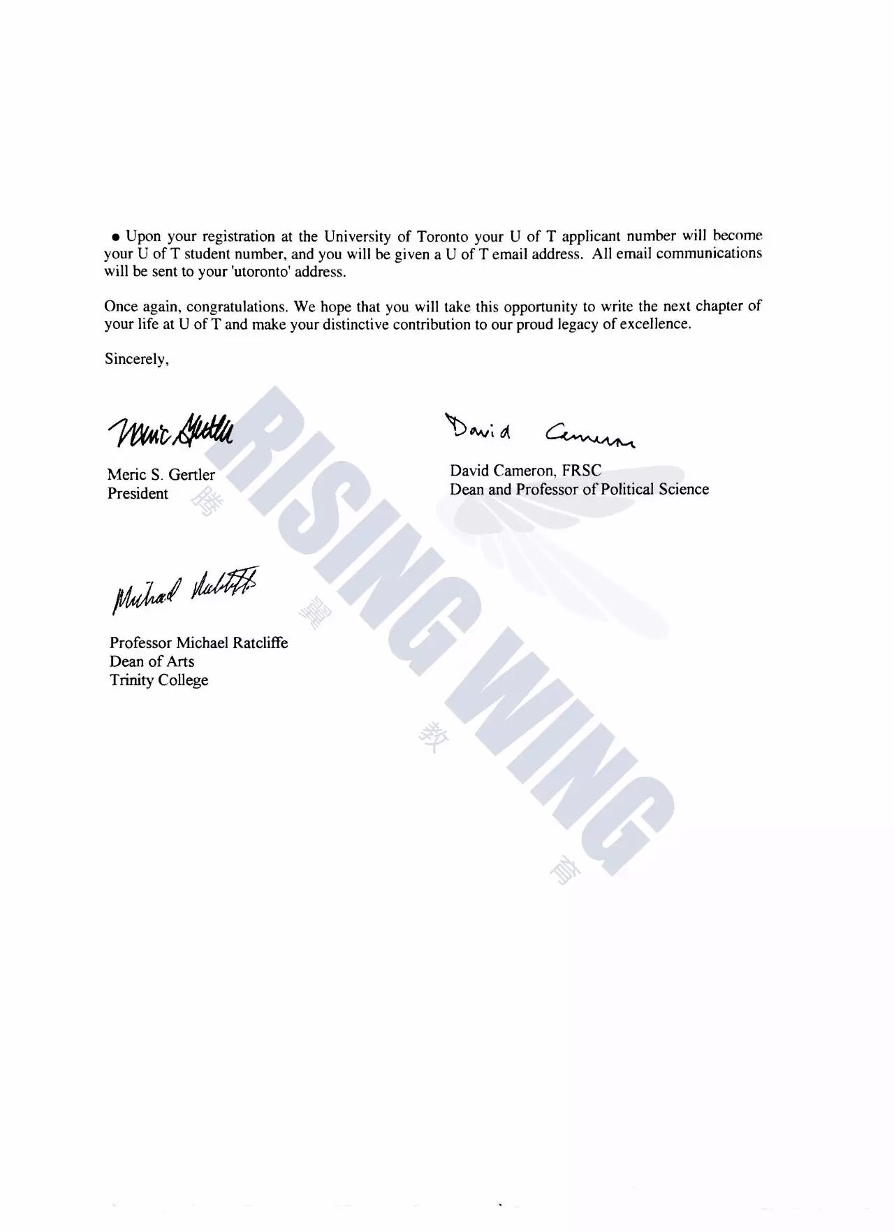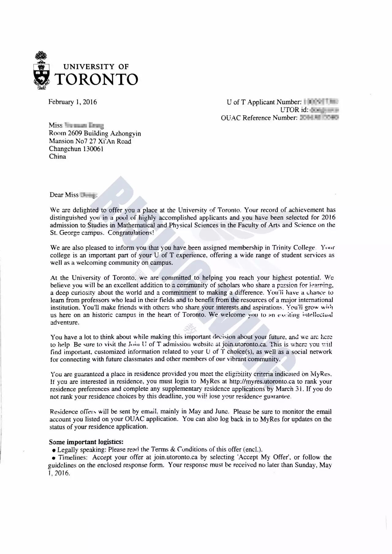 D同学是一个成绩优异的孩子,活泼开朗,多才多艺,擅长多种乐器、舞蹈、摄影和体育运动,课外活动十分丰富,并多次获得奖项,见到她的第一次我就很喜欢。考虑到学生的综合情况,我为她制定了冲刺加拿大顶尖名校的方案,文案老师也在第一时间与学生沟通文书的思路进行头脑风暴,开始准备文书撰写,力求将学生的优势充分展示在文书中。由于名校申请需要学生优异的高考成绩,工作日及周末的白天都不能与学生联系,但同时我们制作的文书又要得到学生的充分认可,因此我们与学生沟通的时间基本都在晚上十点以后。文书经过仔细推敲,最终定稿。在学校申请开放之前,我们就做好了全部准备,在网申开放的第一时间递交申请。同时,针对多伦多大学的面试和UBC的面试,顾问老师、文案老师与学生一起分析要求,多次进行模拟,最终顺利完成。此外,多伦多大学申请环节中需要在限时30分钟内完成一篇未知题目的Essay,为此,文案老师做了充足的准备。同时,多伦多大学后续有两个Essay,其中一个是较难的看图写作,文案老师在与学生进行沟通后,充分发挥发散性思维和想象力,在Essay撰写中充分体现了学生的优势。并且,在材料准备上,包括学校宣传彩页、学生获奖证书等,我们及时地整理好并通过学校官网上传,第一时间递交了齐全的申请材料。功夫不负苦心人,在今年春节前夕,我们收到了多伦多大学主校区的录取通知书,于2月14日情人节收到了纸质录取信。相信这是一份令学生和全家人欣喜的新年礼物!有名校offer在手,学生可以踏实安心地全力备战高考,最终实现名校梦! 我们仍期待UBC、皇后大学和滑铁卢大学的录取通知以及奖学金!