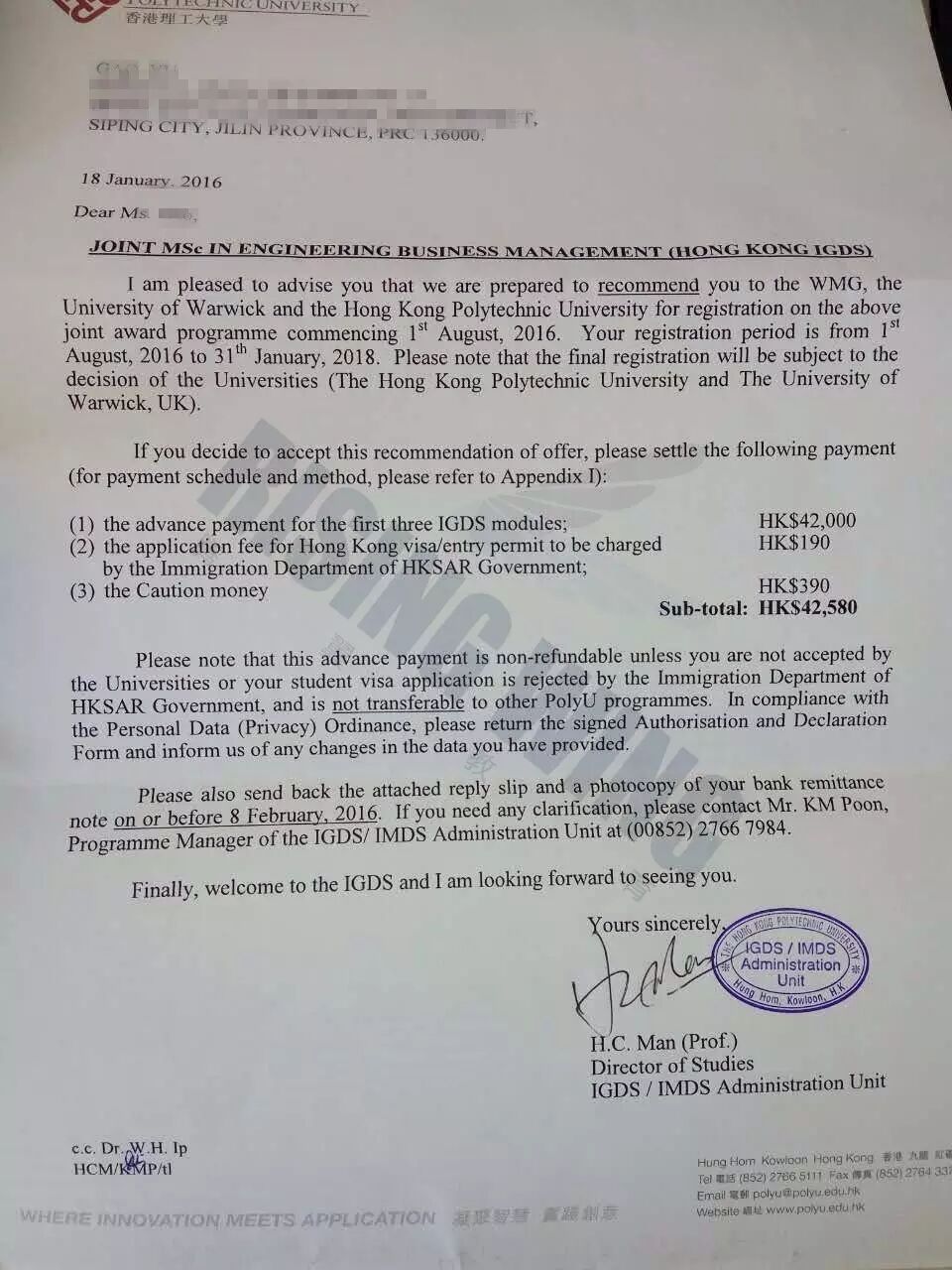 高同学的本科院校背景非常好,浙江大学,既是211又是985,但是她明确表示要转专业,尽量偏商科方向,众所周知香港的商科是第一大热门及难申请的专业,更不要说是非商科背景转商科了。在综合考量了高同学的背景条件以及她的要求后,我为她推荐了香港理工大学的MSc in Engineering Business Management专业,该专业由香港理工大学和英国名校华威大学共同开设,课程实用且含金量高,涵盖了财务、人事、管理、企业运营等一系列商科相关专业,学生看过课程设置后也很心仪。由于学生签约早,准备时间长,所以在理工大学系统开通申请的第二天我们就递交了申请,很快便收到了学校面试通知,我们迅速的为学生准备相关复习材料,并进行模拟培训,果然功夫不负有心人,学生顺利的通过了面试,很快就收到了香港理工大学的正式offer。